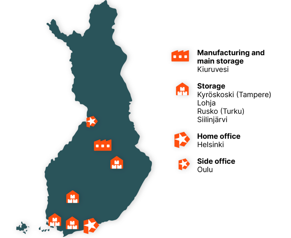 Pyylahti headquarters is in Helsinki, and we have office in Oulu. Our production facilities and main storage is in Kiuruvesi. Other storages are in Siilinjärvi, Kyröskoski (Tampere), Lohja and Rusko (Turku).